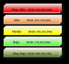 El análisis de amenazas, peligros, vulnerabilidad y riesgos, es representado en cinco rangos cualitativos, mencionando los valores mínimos y máximos entre cada rango. El mapa indica las zonas de vulnerabilidad en rojo, verde y amarillo, es decir, se emplea el código internacional de colores para tráfico vehicular, añadiéndose el naranja, entre el rojo y el amarillo; y el verde claro entre el amarillo y el verde. Se utilizará la siguiente combinación de colores para su correcta representación cartográfica (RGB = Red-Green-Blue):